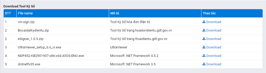 Để cài đặt các công cụ này, sau khi đăng nhập vào phần mềm Autoinvoice quý khách vào đường dẫn: Hệ Thống > Download Tool Ký Số như hình bên dưới, trong đây sẽ có đầy đủ các file cài đặt đã được Autoinvice upload lên phần mềm để quý khách có thể tải về và cài đặt sử dụng.