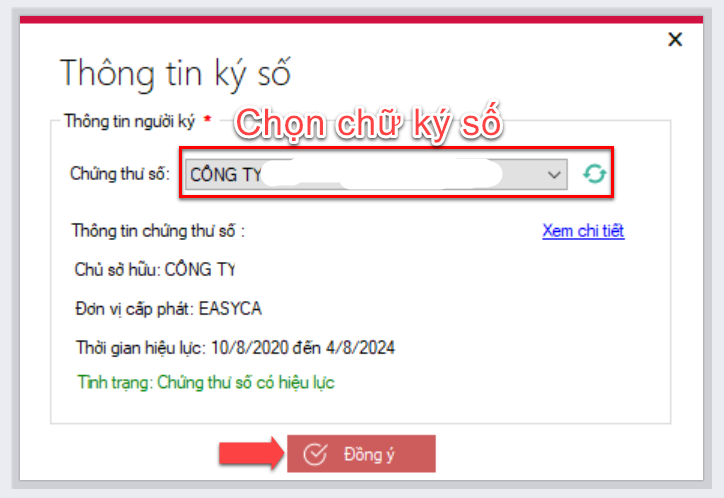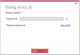 Quý khách chỉ cần chọn thông tin chữ ký số đang cắm vào máy tính của mình, và bấm đồng ý để hoàn tất quá trình thêm chữ ký số lên phần mềm.