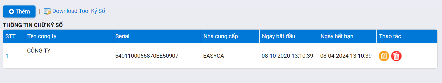 Khi bấm vào Thêm sẽ xuất hiện màn hình quản lý chữ ký số.