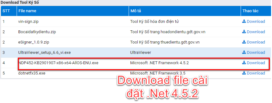 Để tải và cài đặt .NET Framwork 4.5.2 quý khách vào menu Hệ Thống > Download Tool Ký Số, quý khách tải về file Microsoft .NET Framework 4.5.2