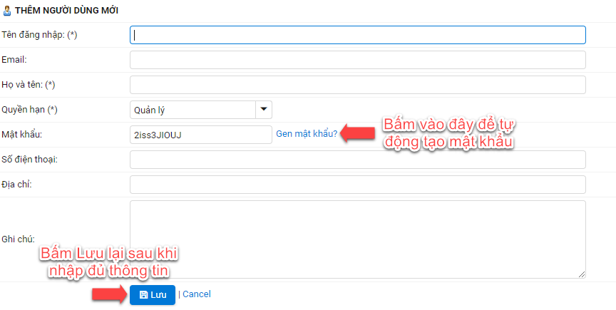 + Mật khẩu quý khách có thể nhập vào hoặc bấm Gen mật khẩu? để tự động tạo mật khẩu